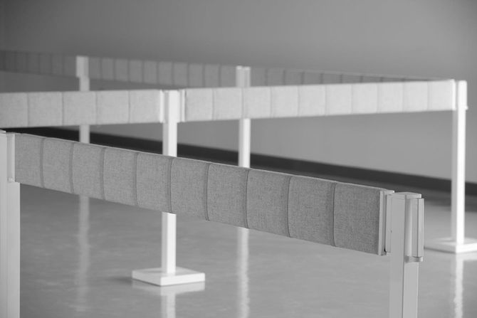 The modular sculptural components take the form of temporary ‘barriers’, which play between a work of art and functional object. Consciously referencing seminal hard-edged minimalist modular-configurations such as Donald Judd’s floor-based open frame-like structures, these works are upholstered and intricately embroidered through the labour intensive process of darning. Rather than take centre-stage like their minimalist counterparts, they might easily be mistaken for institutional furniture, where the self-effacing labour intensity of their production would go unnoticed.